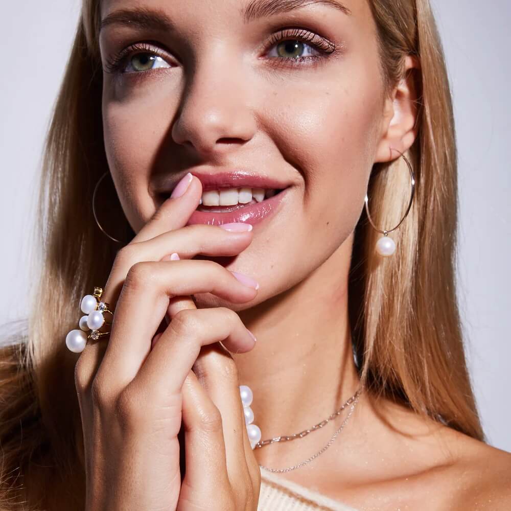 Mudelit kaunistavad valged mageveepärlid läbimõõduga 6–8 mm hea kvaliteediga ja tsirkoonid.