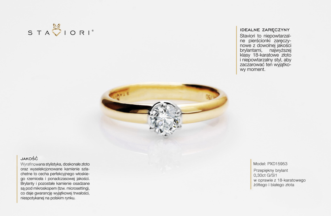 Kollasest 0,750 kullast Staviori sõrmus, täis sära. Briljant- ja printsesslõikelised teemandid moodustavad ainulaadse, muljetavaldava valgusega geomeetrilise kujunduse. See on tõeline juveelikunsti teos, mis püüab pilku ja rõhutab omaniku peent maitset. Ideaalne valik naisele, kes hindab luksust ja omanäolist stiili.