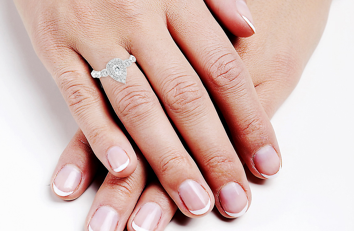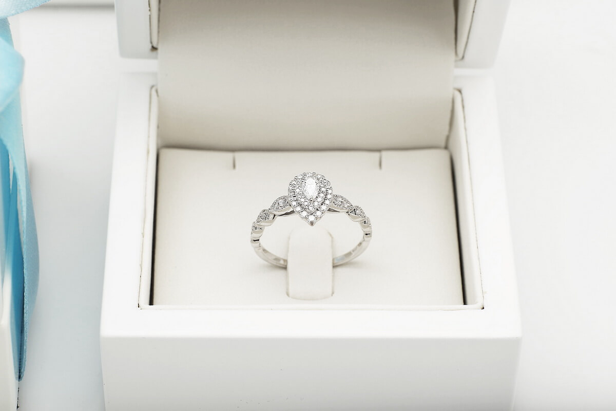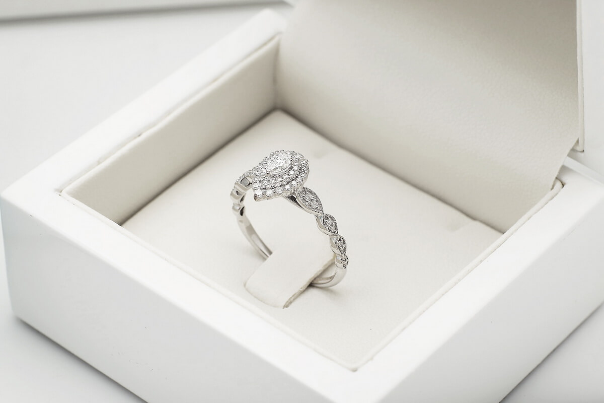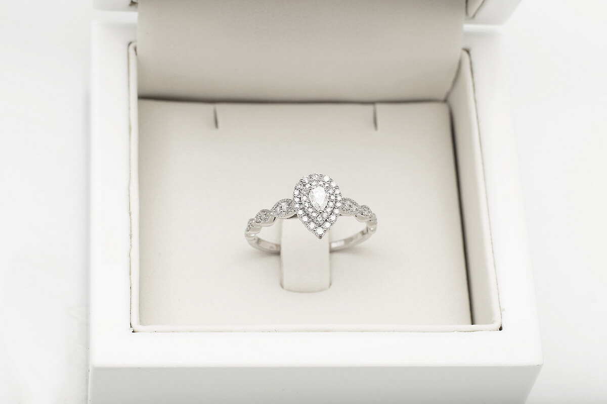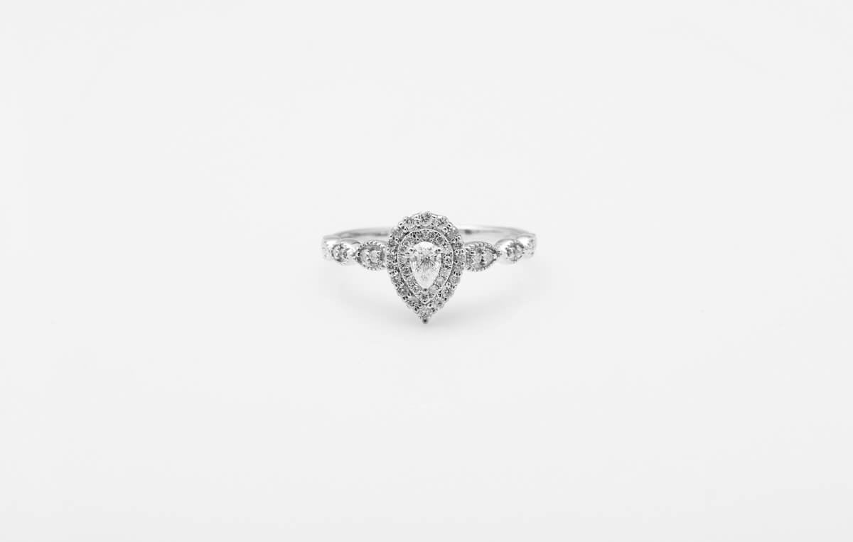 Kaunis sõrmus pirnikujulise (PEAR) keskse teemandiga ja 47 briljandiga. Erakordne ja imeliselt särav, sobib mitte ainult suurepäraseks kingituseks, vaid ka ideaalseks kihlumiseks.