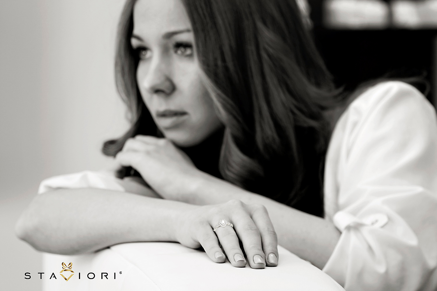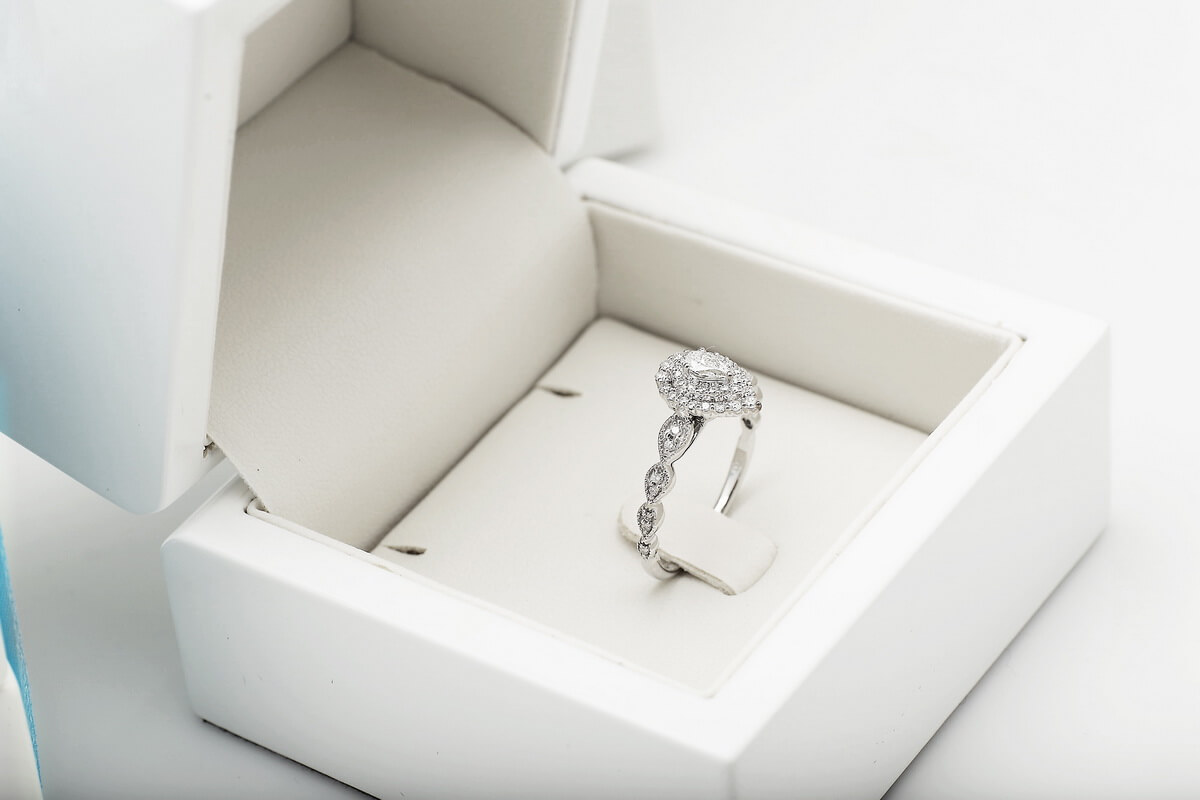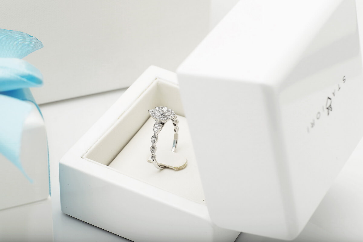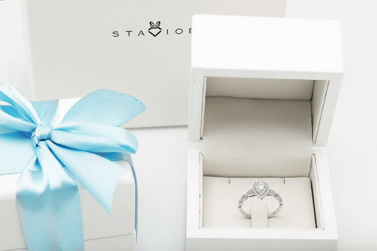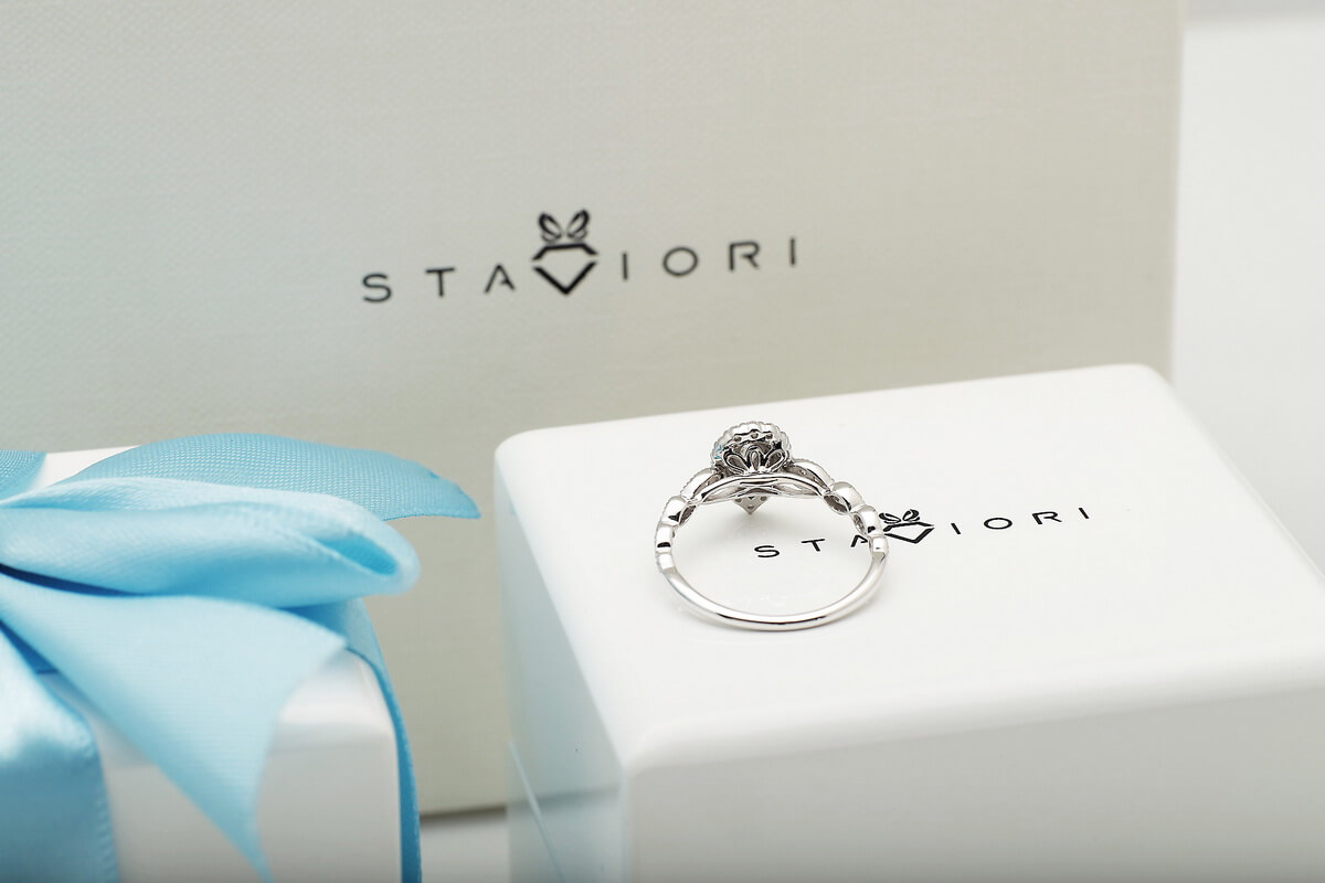 Kaunis sõrmus pirnikujulise (PEAR) keskse teemandiga ja 47 briljandiga. Erakordne ja imeliselt särav, sobib mitte ainult suurepäraseks kingituseks, vaid ka ideaalseks kihlumiseks.