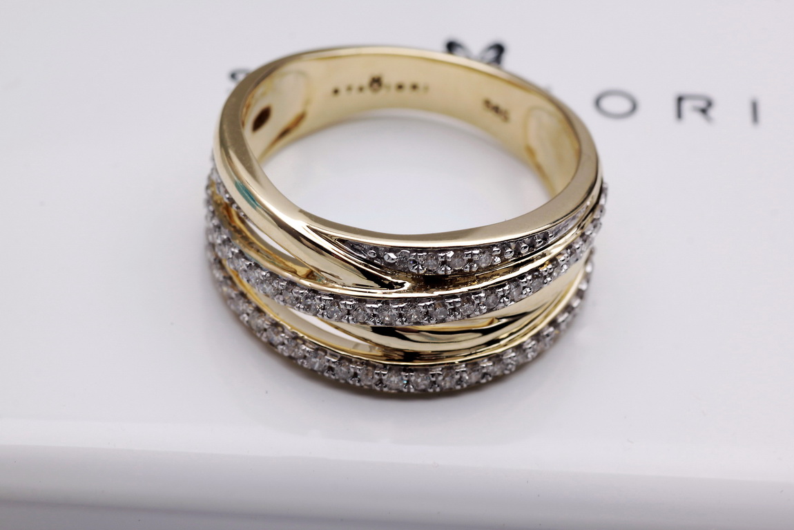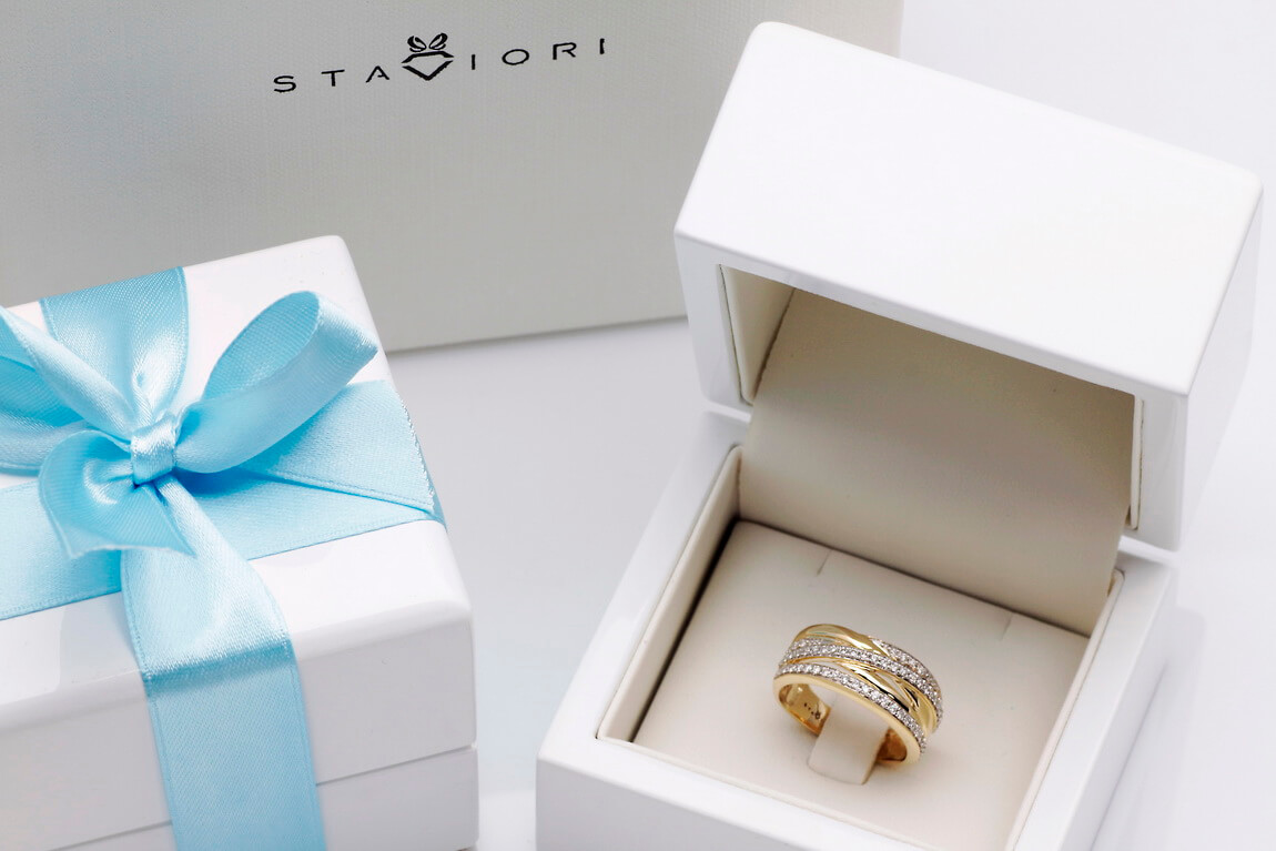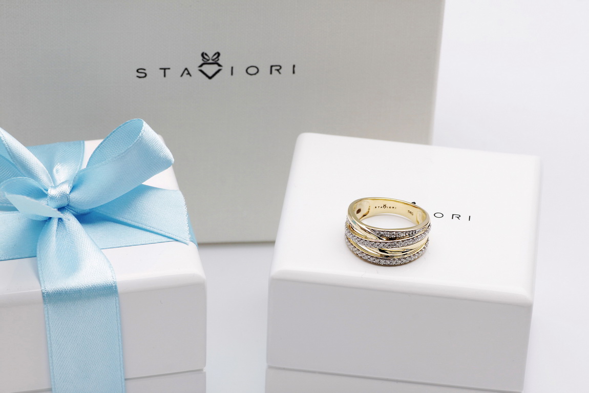 Kollasest 0,750 kullast Staviori sõrmus, täis sära. Briljant- ja printsesslõikelised teemandid moodustavad ainulaadse, muljetavaldava valgusega geomeetrilise kujunduse. See on tõeline juveelikunsti teos, mis püüab pilku ja rõhutab omaniku peent maitset. Ideaalne valik naisele, kes hindab luksust ja omanäolist stiili.
