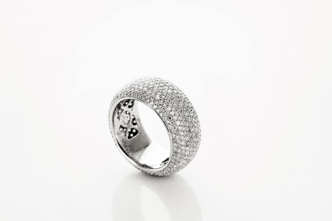 Kollasest 0,750 kullast valmistatud peen ja graatsiline sõrmus, kaunistatud 68 särava teemandiga kogukaaluga 0,21 ct. Salendav vorm annab sellele erakordse kerguse ning briljantide ühtlane rida loob kogu sõrmuse ümber elegantse sära efekti. Sobib suurepäraselt nii õrna pulmasõrmusena kui ka iseseisvalt või koos teiste sõrmustega kantava elegantse lisandina.