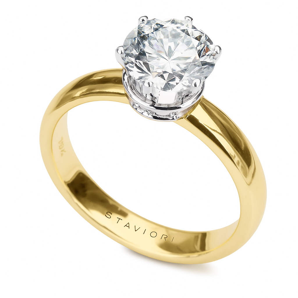 Kollasest 0,750 kullast Staviori sõrmus, täis sära. Briljant- ja printsesslõikelised teemandid moodustavad ainulaadse, muljetavaldava valgusega geomeetrilise kujunduse. See on tõeline juveelikunsti teos, mis püüab pilku ja rõhutab omaniku peent maitset. Ideaalne valik naisele, kes hindab luksust ja omanäolist stiili.