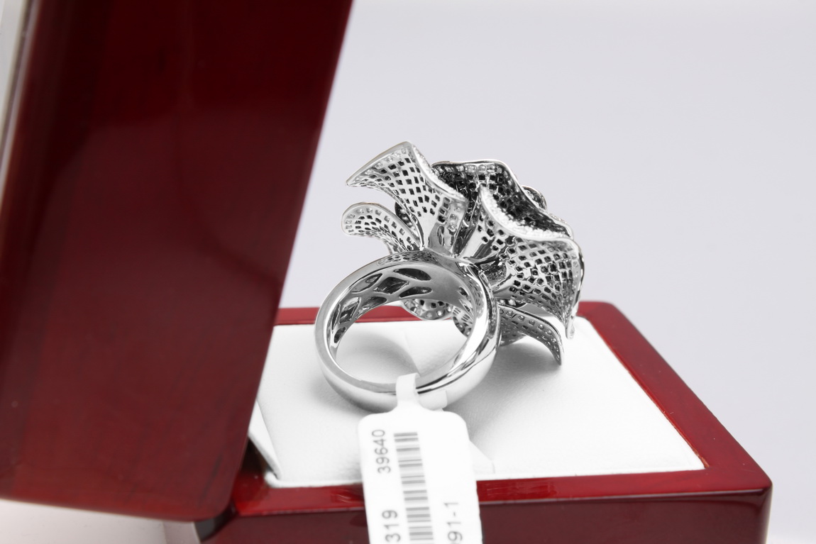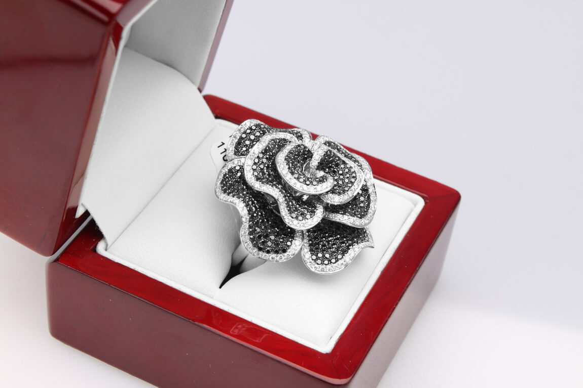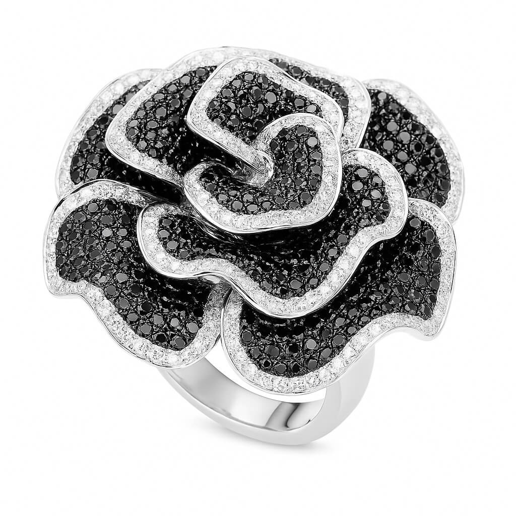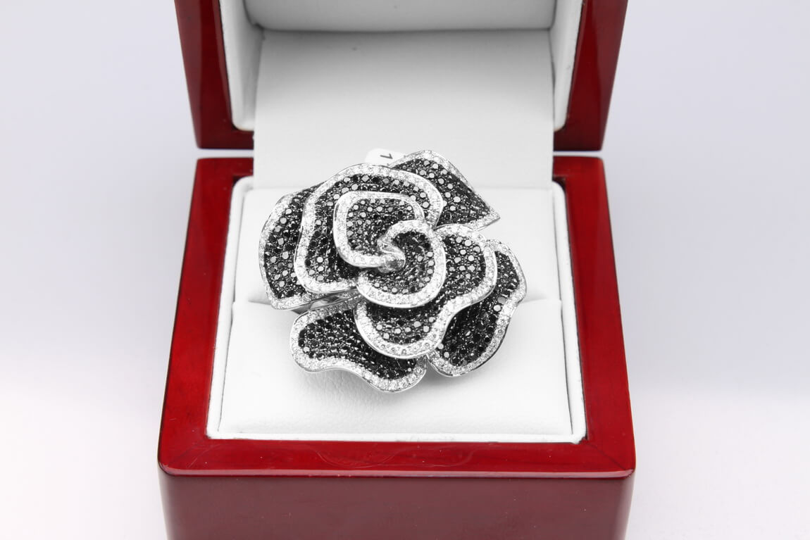 Eksklusiivne | Valge kullaga sõrmus mustade ja valgete teemantitega roosikujuliselt