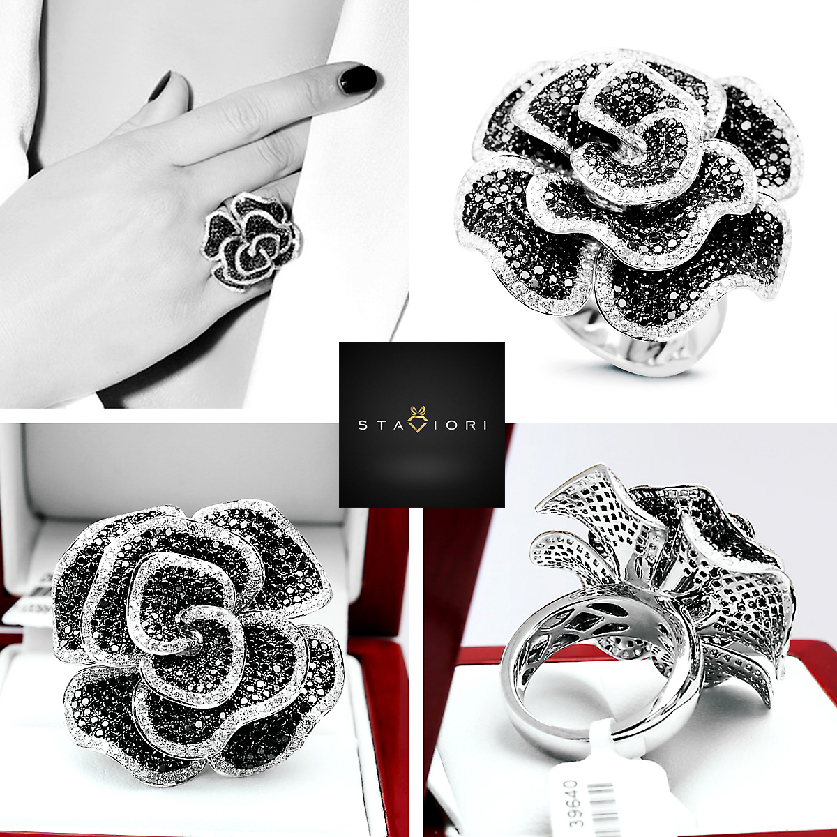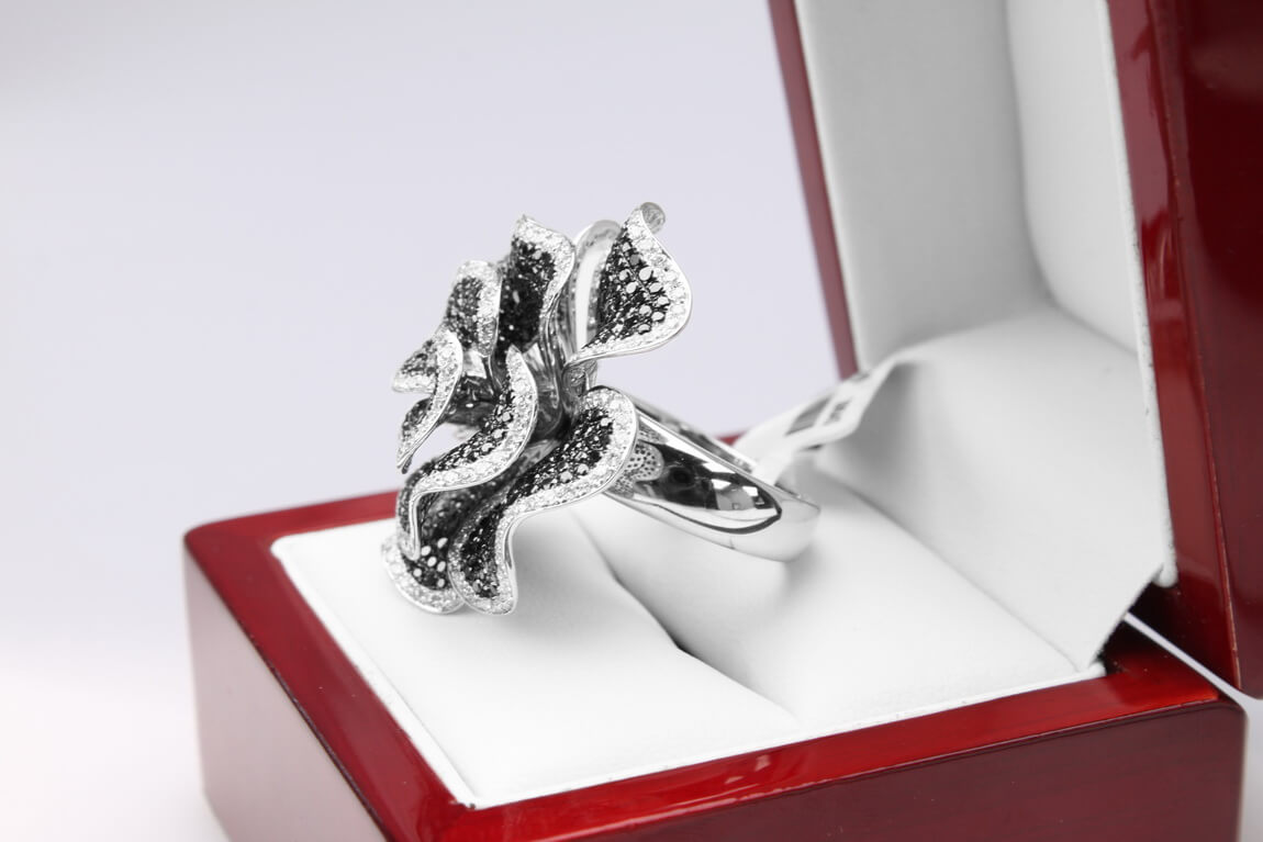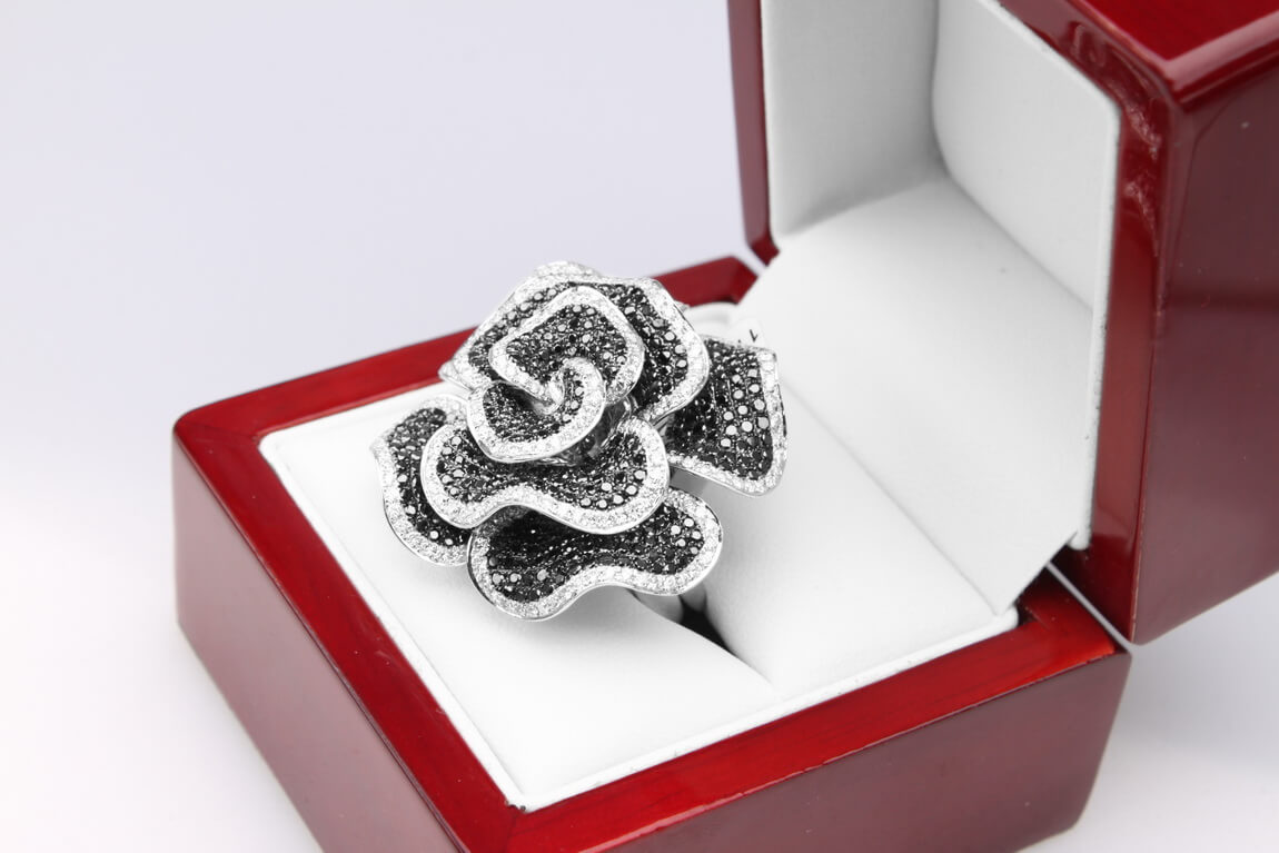Eksklusiivne | Valge kullaga sõrmus mustade ja valgete teemantitega roosikujuliselt
