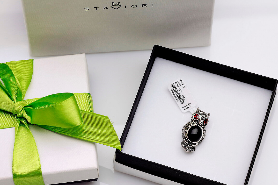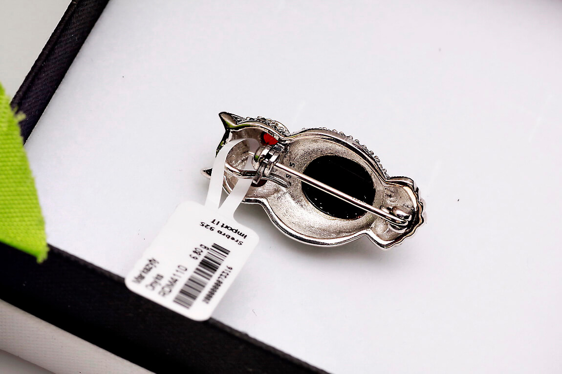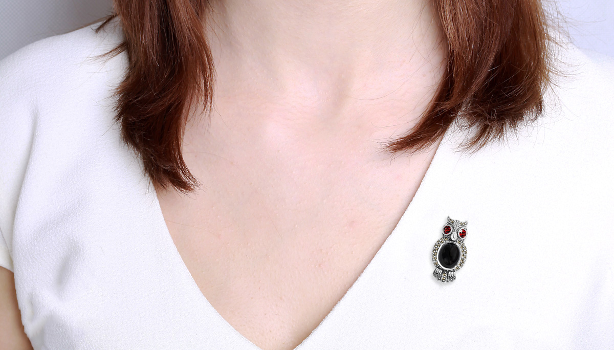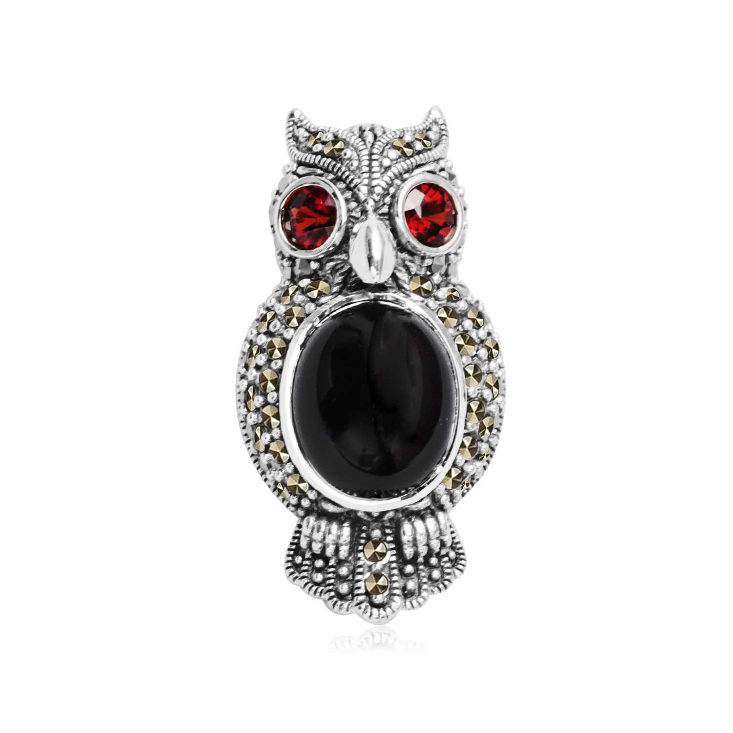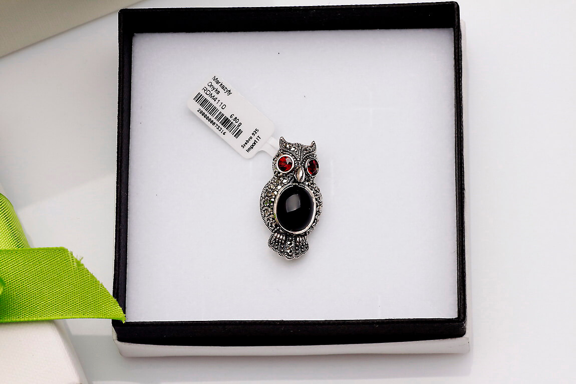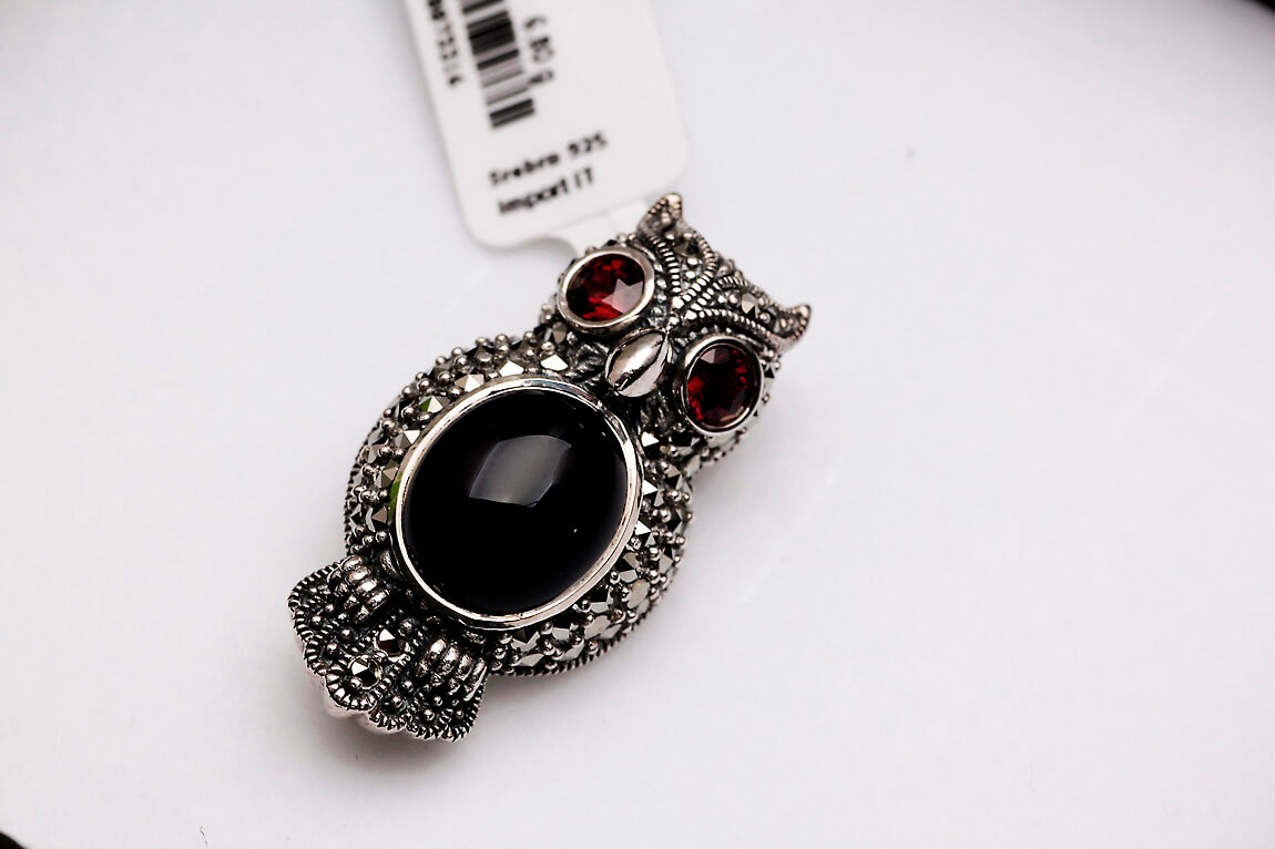 Hõbedast pross-ripats öökull, onyksi, granaadi ja markasiidiga