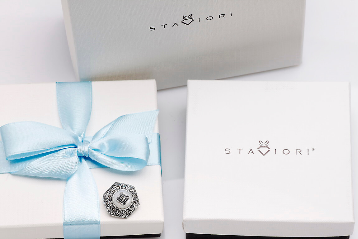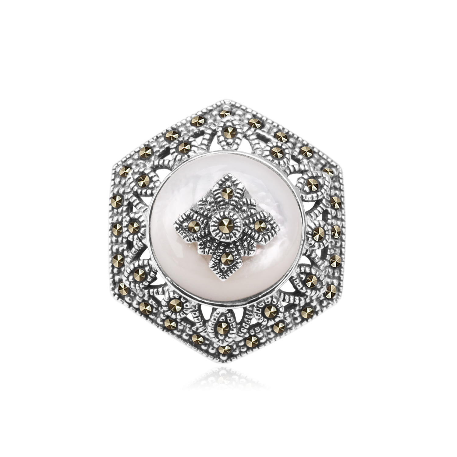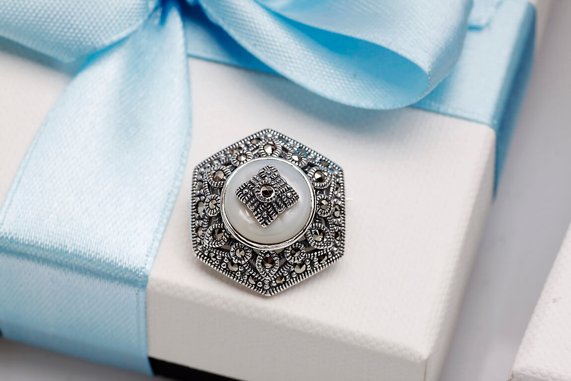 Klassikaline ümmargune pross, mis on valmistatud roodiumkattega 0,925 hõbedast. Selle ažuurne kompositsioon on kaunistatud läikivate markasiitidega, mis rõhutavad kenasti iga detaili ja annavad ehtele omanäolise elegantsi. Mitmekülgne ja ajatu disain muudab broshi suurepäraseks kaunistuseks nii igapäevasteks kui ka õhtusteks riietusteks.