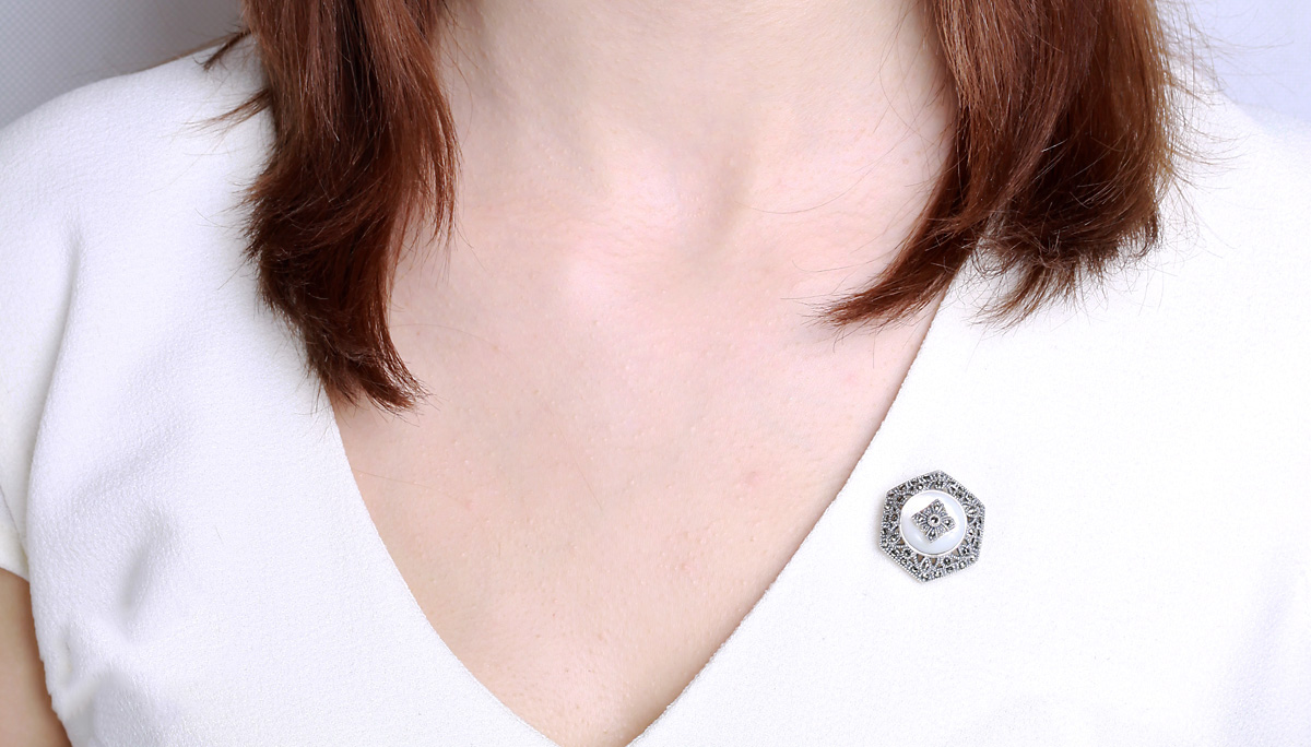 Peenike lehvikukujuline pross, valmistatud rooditud hõbedast 0,925. Selle pind on kaunistatud läikivate markasiitidega, mis annavad ehtele elegantsi ja sära. Keskmine element on sügav must onyks, mis kontrasteerub kaunilt hõbedaga, rõhutades ehte erilist iseloomu. See on stiilne kaunistus, mis sobib suurepäraselt nii igapäevasteks kui ka õhtustilisteks.