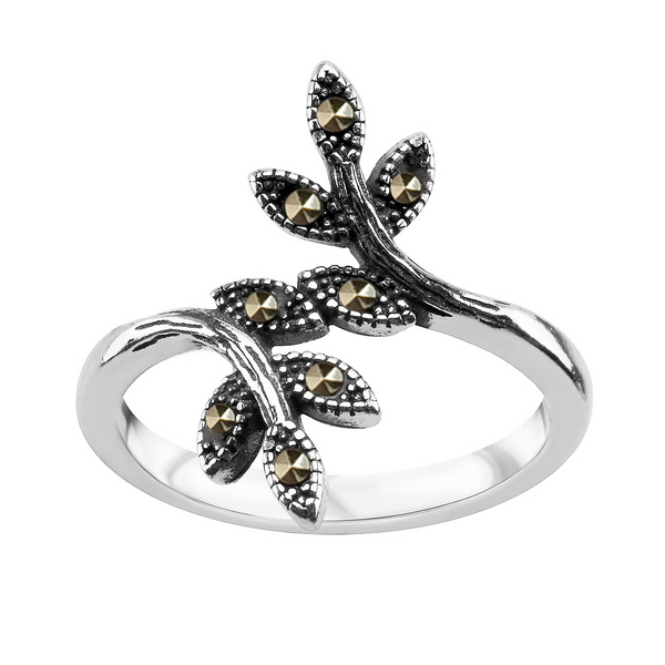 Hõbedast sõrmus lehemotiiviga ja markasiitidega, suurus 13