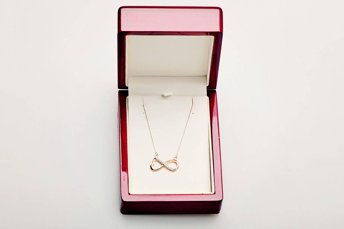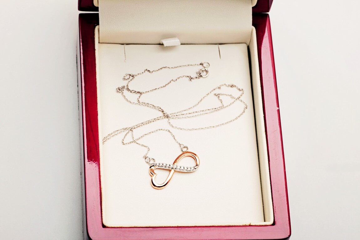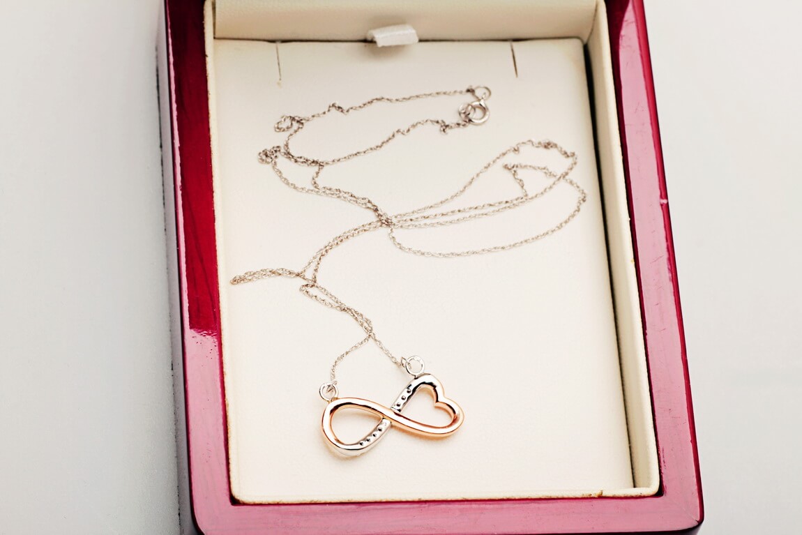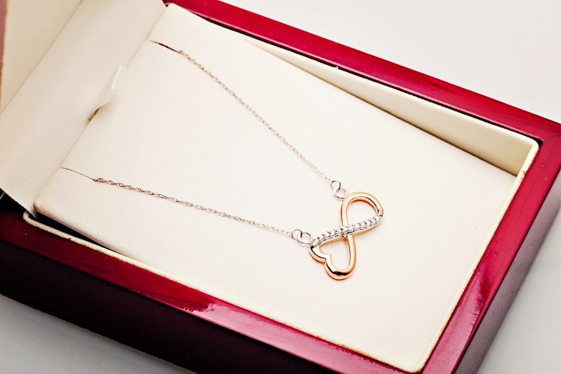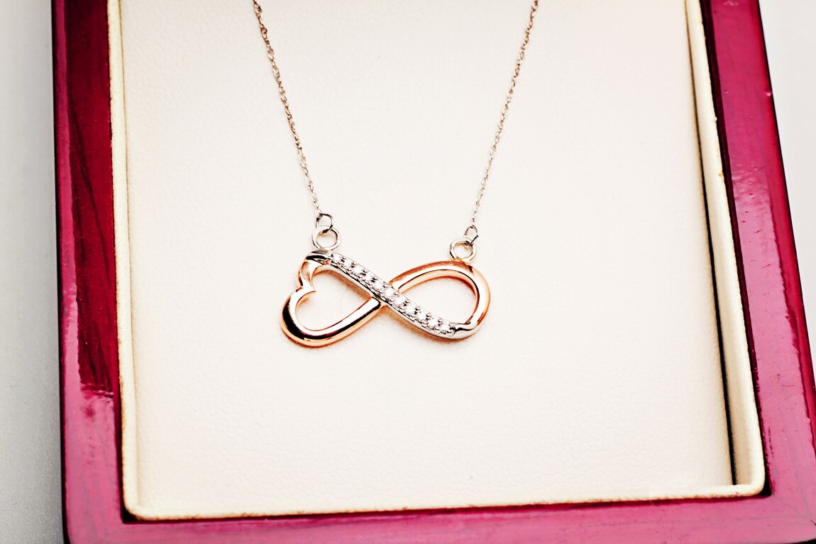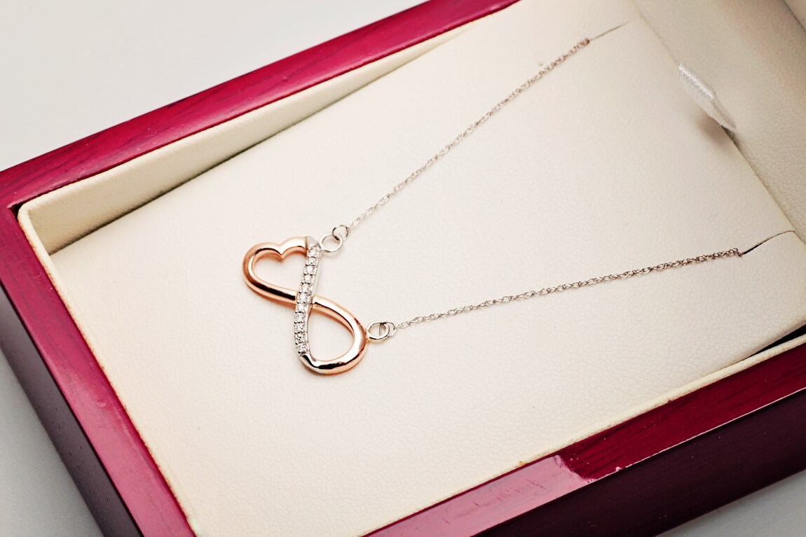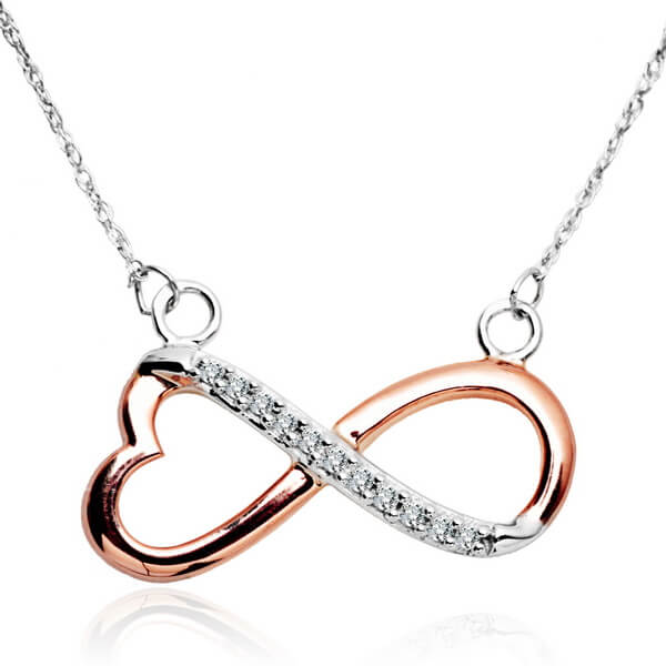 Kaelakee teemantite ja südame-ning lõpmatuse sümboliga, roosa kuld