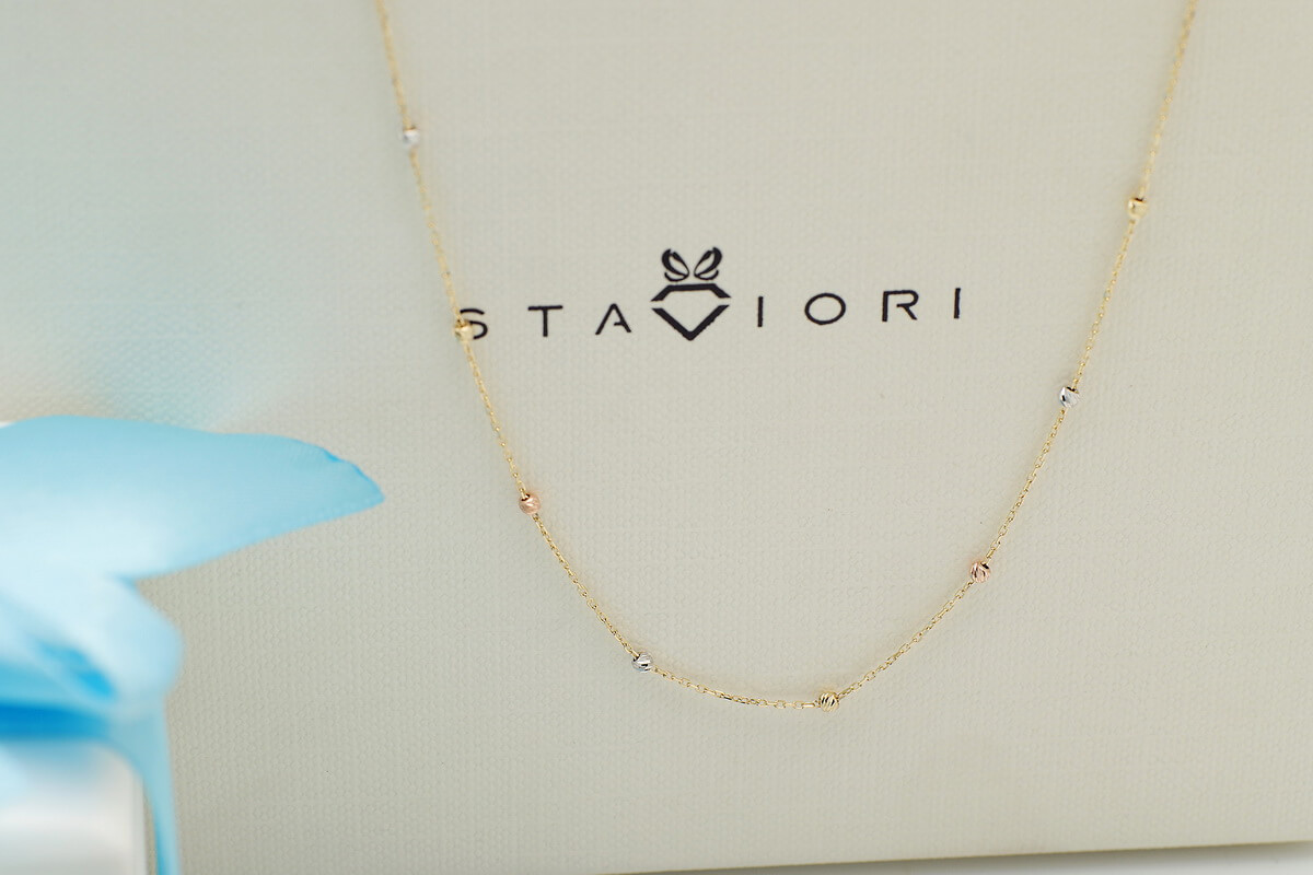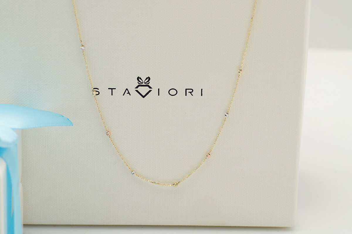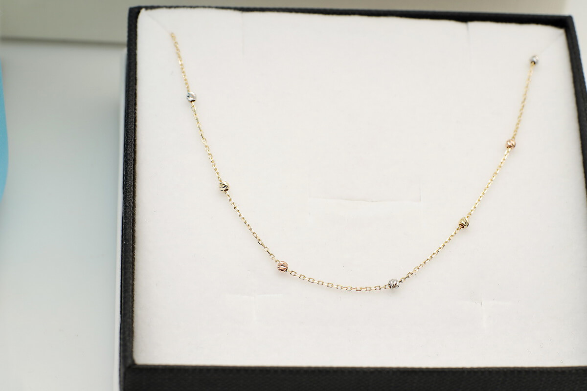 Täpselt valmistatud kuldne CHOKER prooviga 585. Ankurkett kaelakee kaunite, teemanditud pallikestega kolmes värvitoonis kullast.