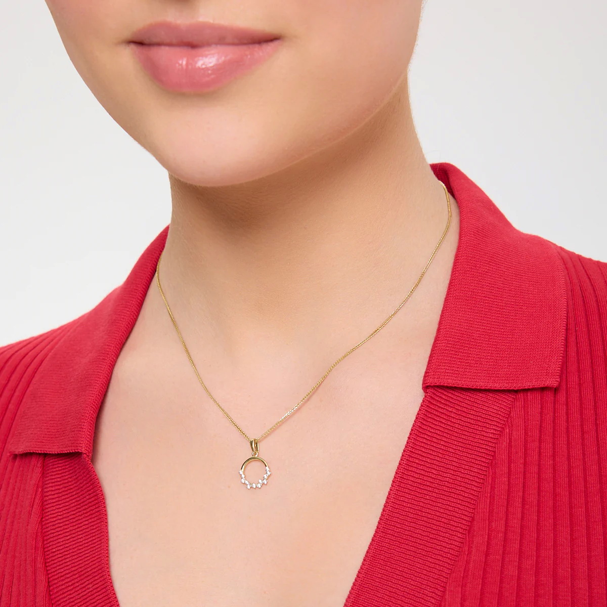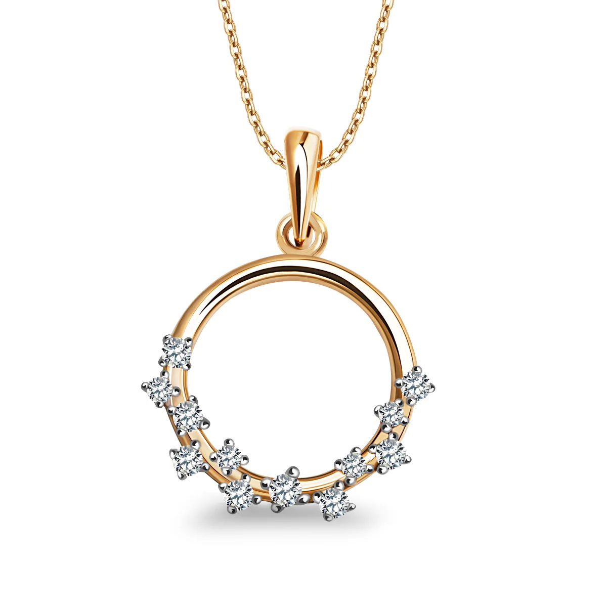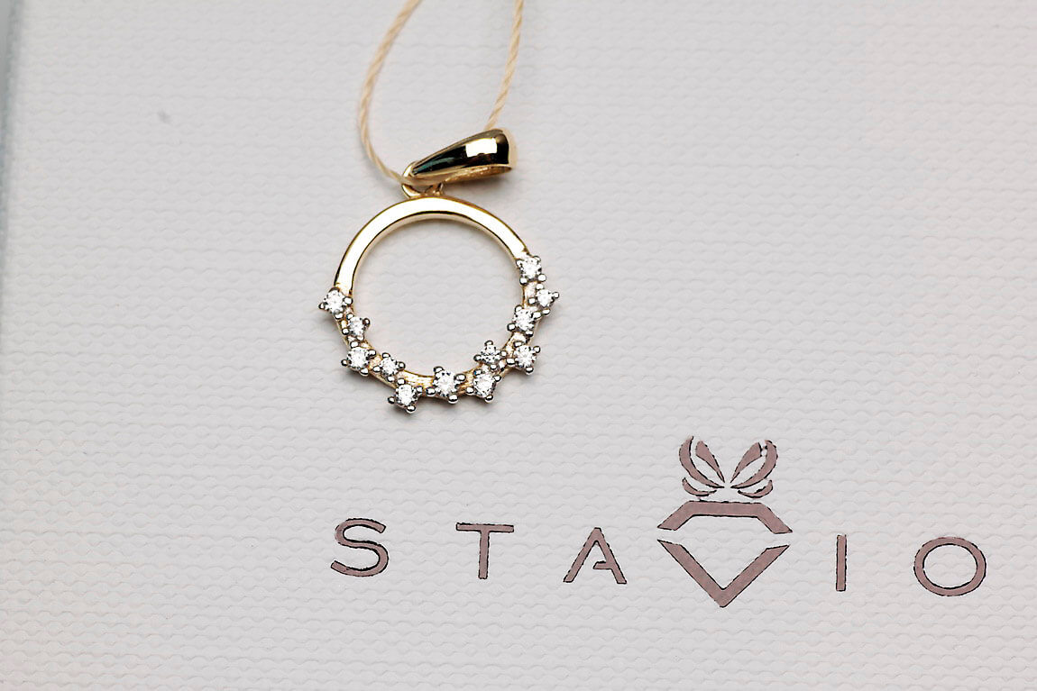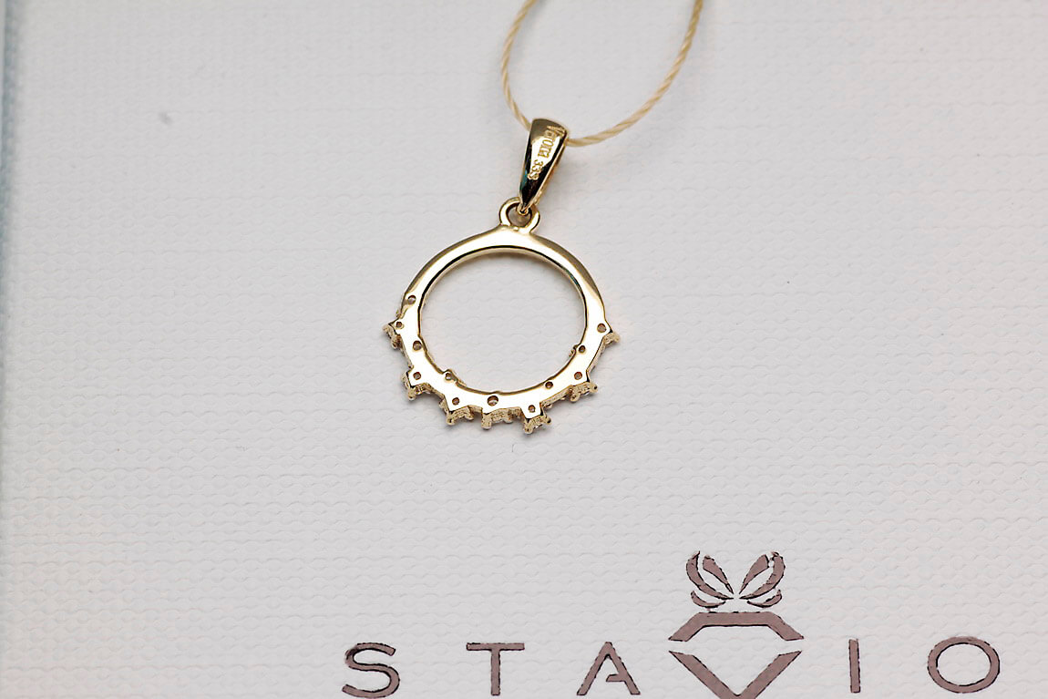 Särav kollasest kullast 0,585 ripats, kaunistatud 26 teemandiga kogumassiga 0,18 ct. Õrnad briljandid umbes 10 mm läbimõõduga kinnituses moodustavad elegantse, ümara motiivi, mis paistab silma sära ja rafineeritusega. Ideaalne valik naistele, kes hindavad luksust ja klassikalist stiili. See ripats on suurepärane kingitus eriliseks sündmuseks, rõhutades iga naise individuaalset stiili.