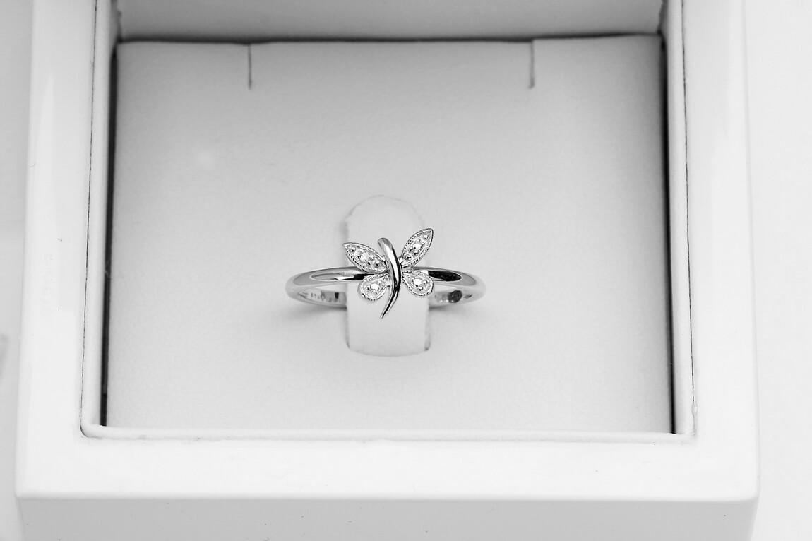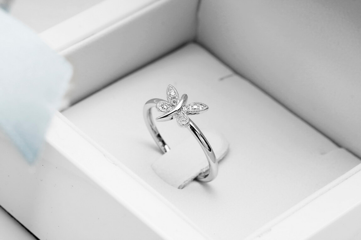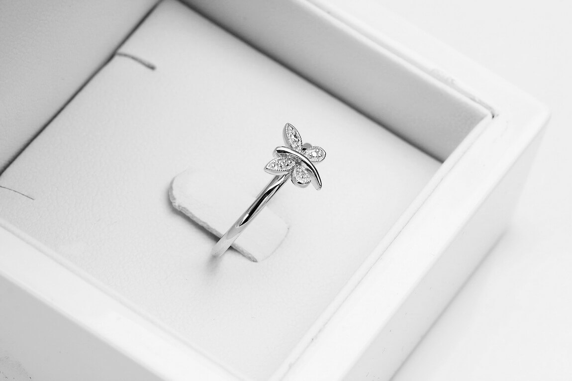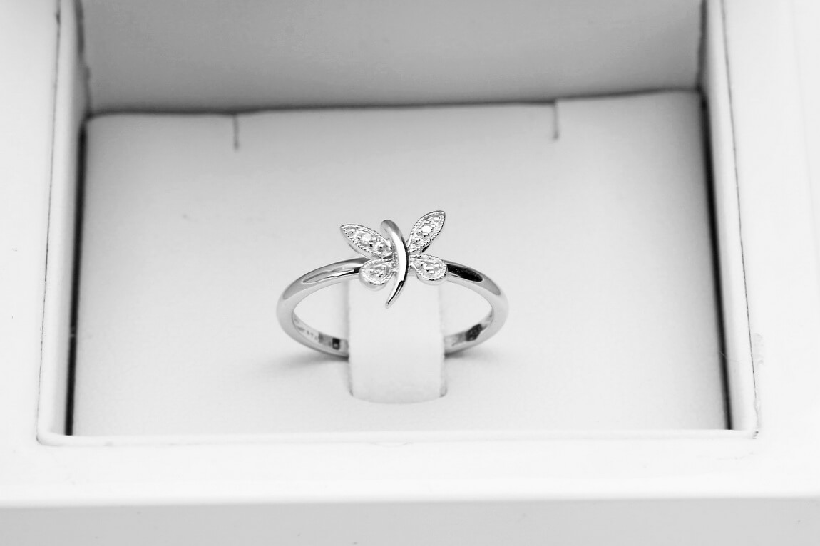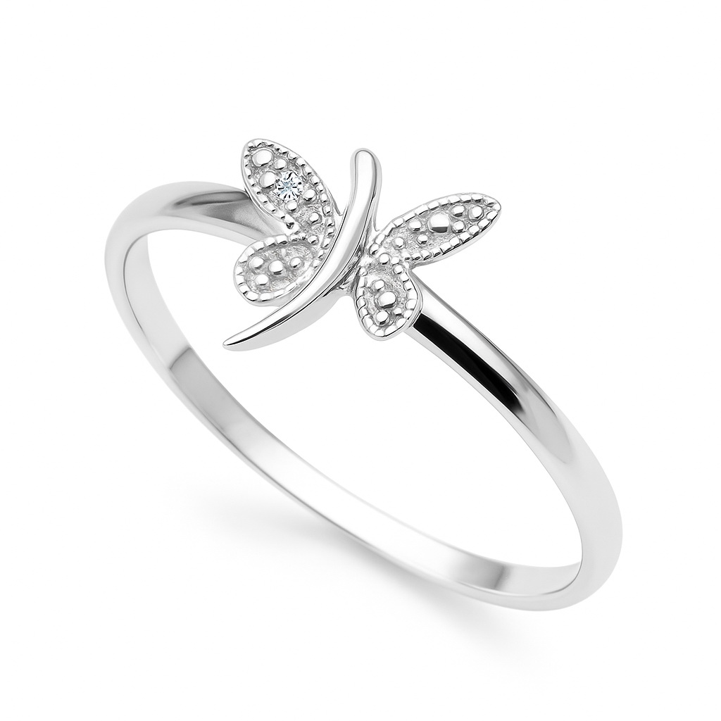 Liblikaga sõrmus valgest kullast teemandiga