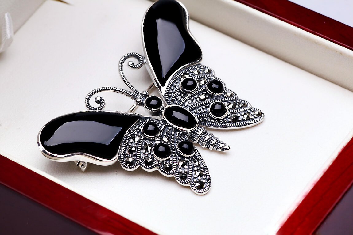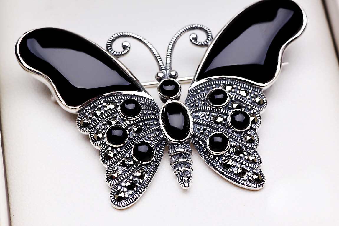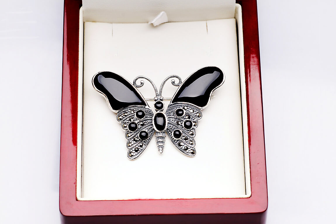 Pross hõbedast liblikas oonüksite ja markasiitidega