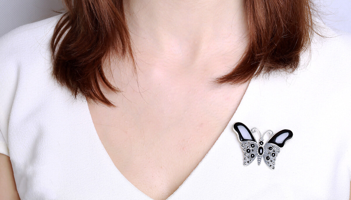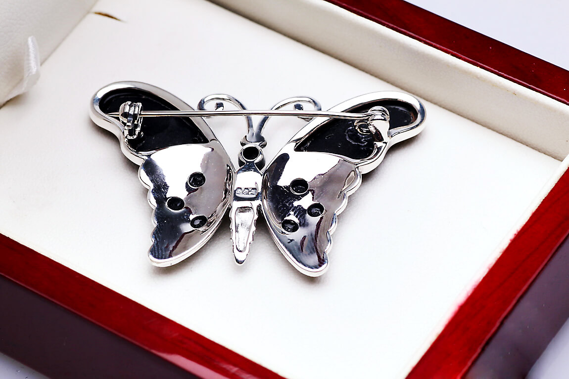 Hõbedane pross, liblikas, emailiga ja markasiitidega