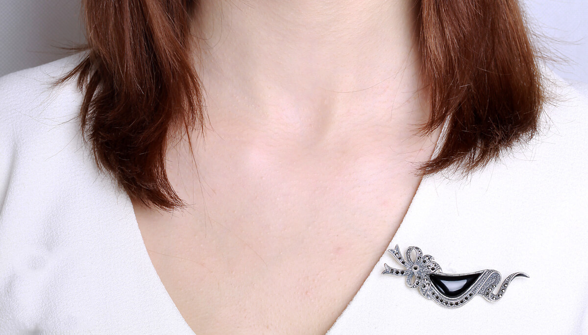 Geomeetrilise kujuga roodiumkattega 0,925 hõbedast pross. Selle keskpunktis on särav pärlmutter, mille sära rõhutavad läikivad markasiidid. Peenike, ažuurne viimistlus annab kogu ehtele klassikalise ja omanäolise ilme. Prossi saab kanda ka ripatsina, muutes selle mitmekülgseks kaunistuseks erinevateks sündmusteks.
