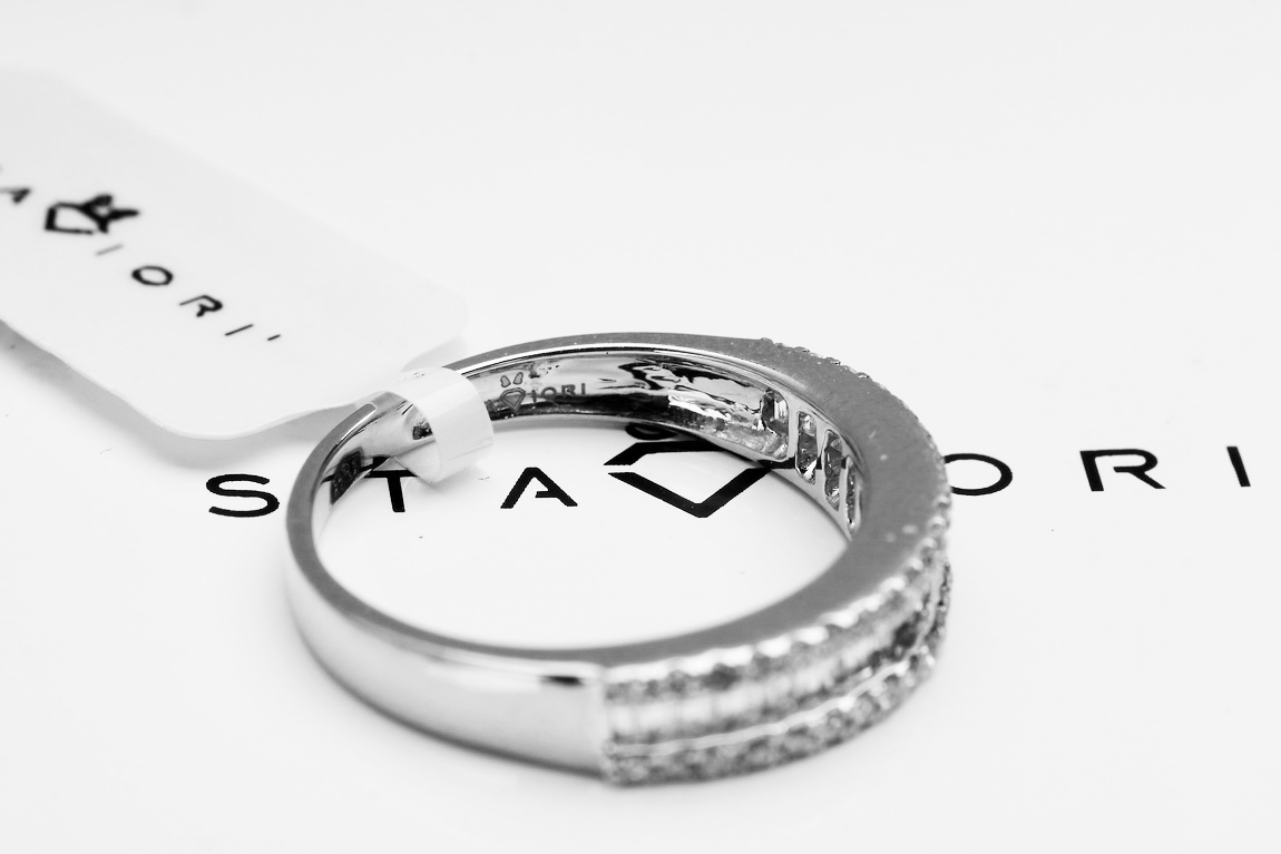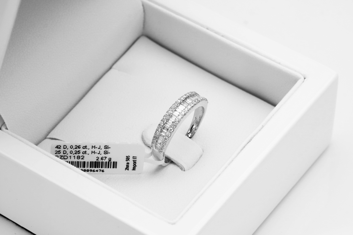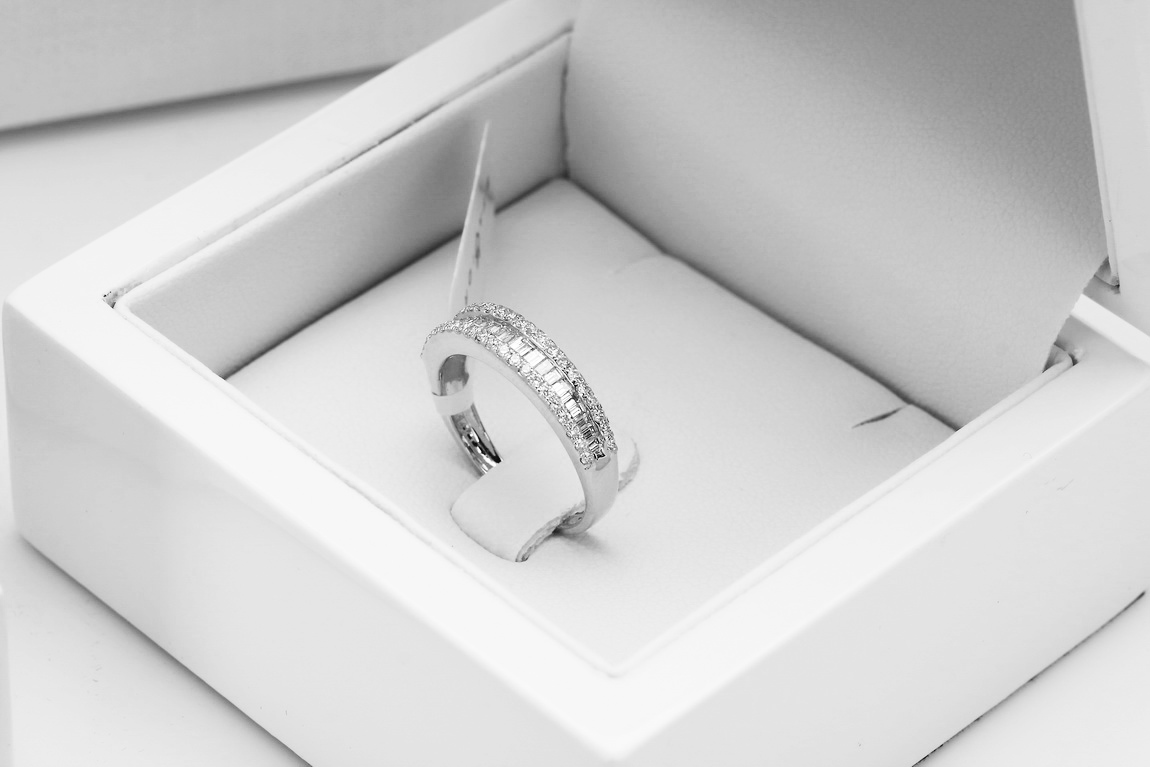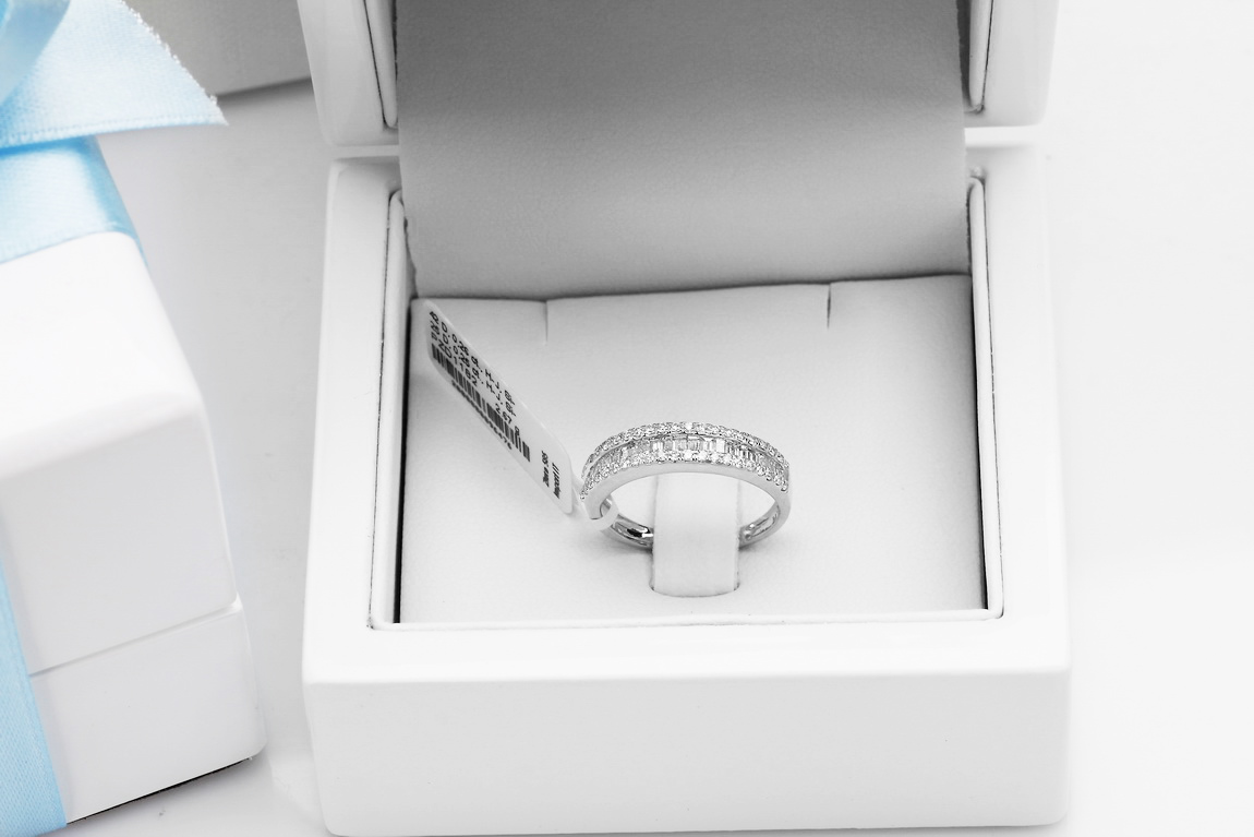 valgest kullast sõrmus briljantide ja baguet-lõikeliste teemantidega