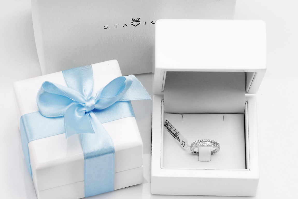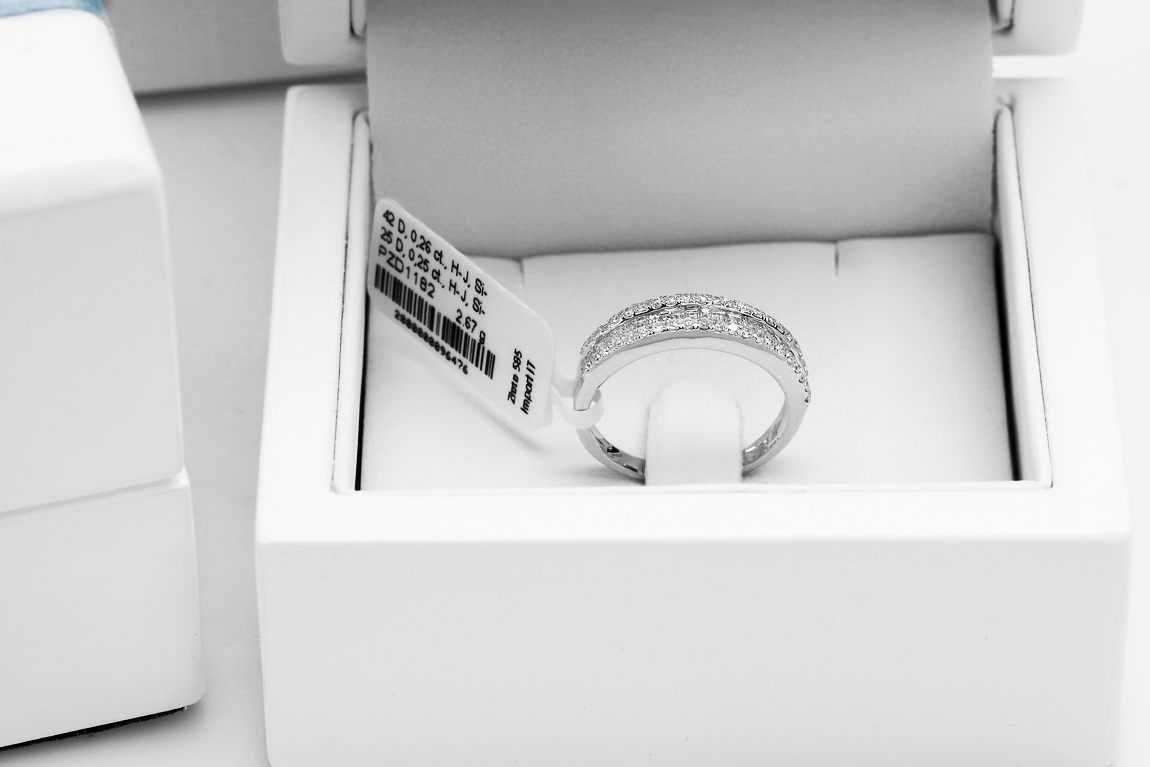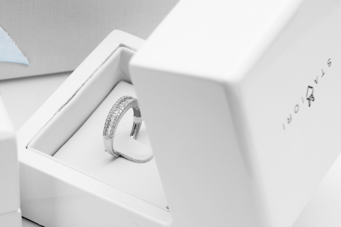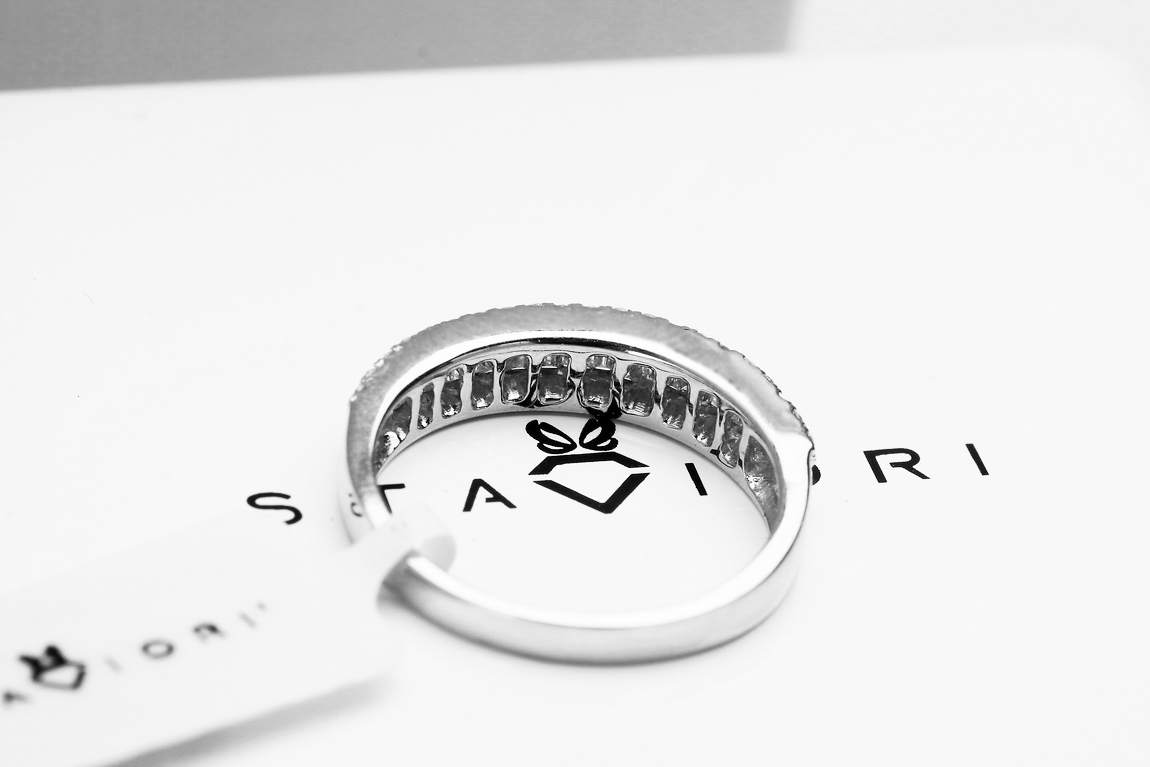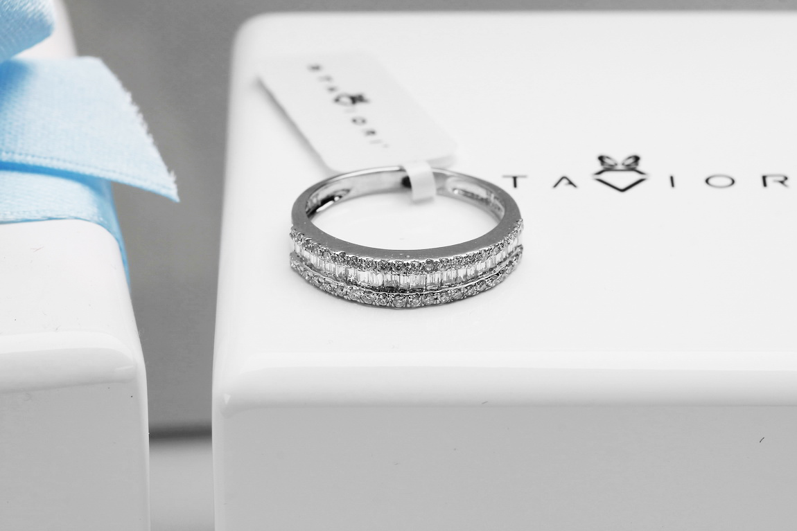 valgest kullast sõrmus briljantide ja baguet-lõikeliste teemantidega