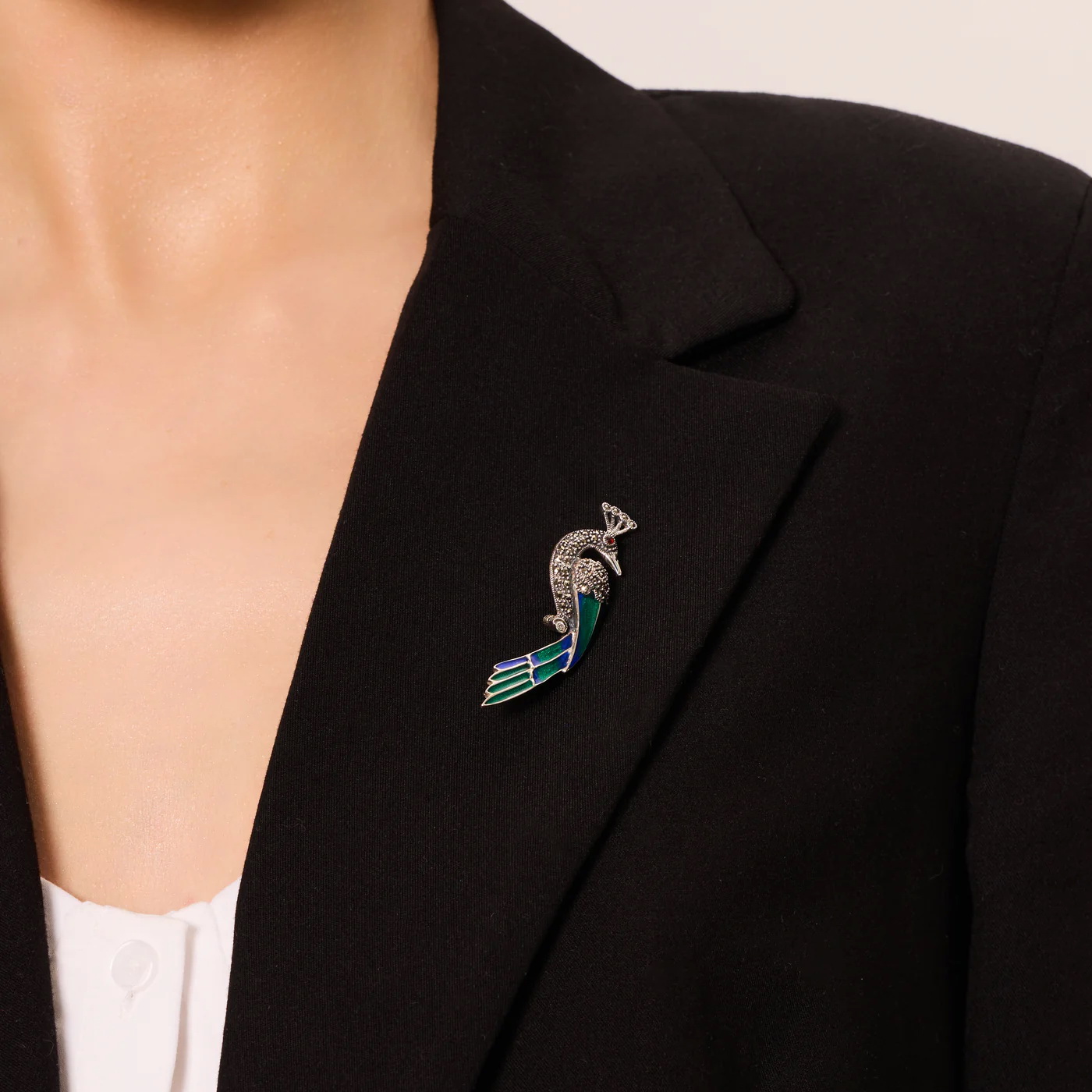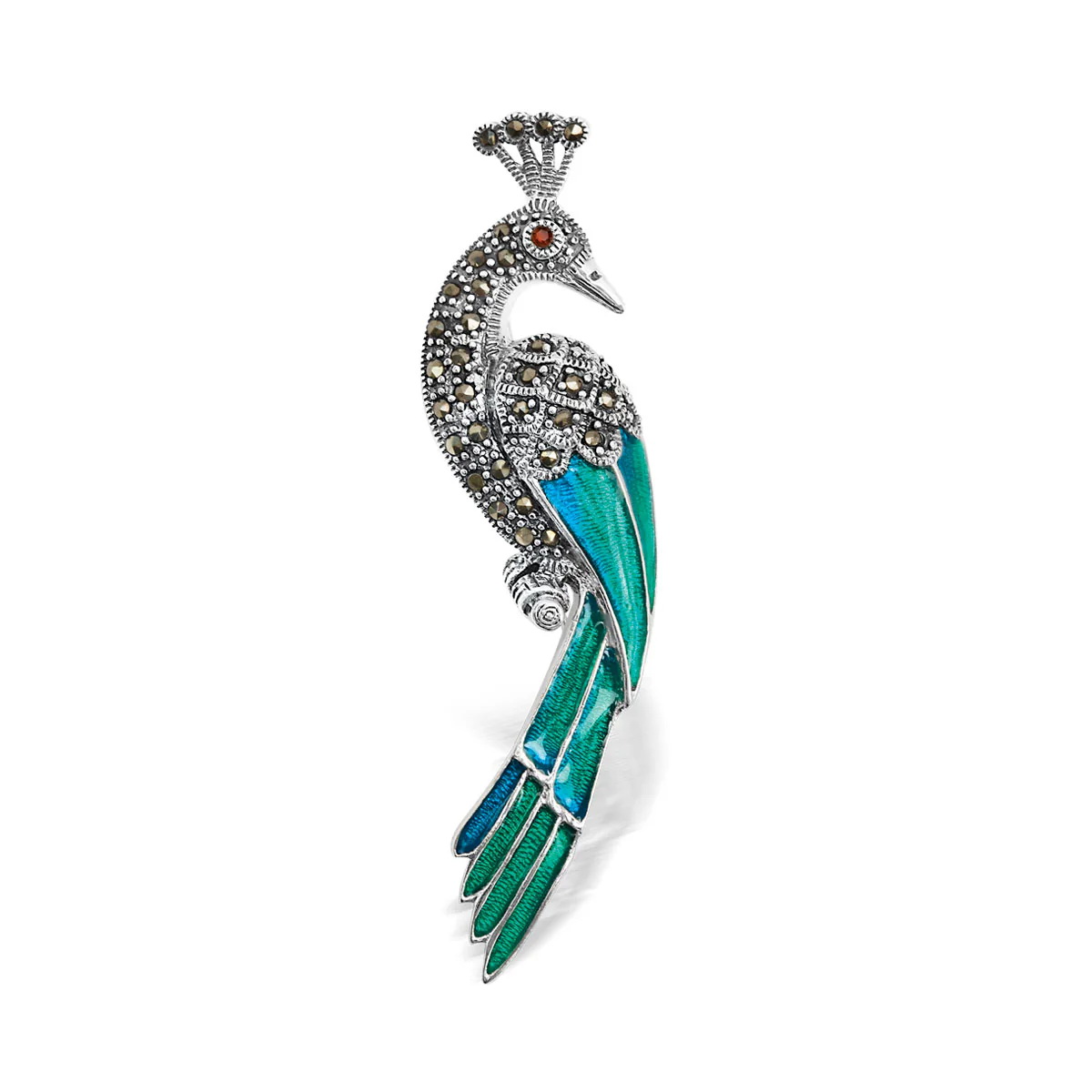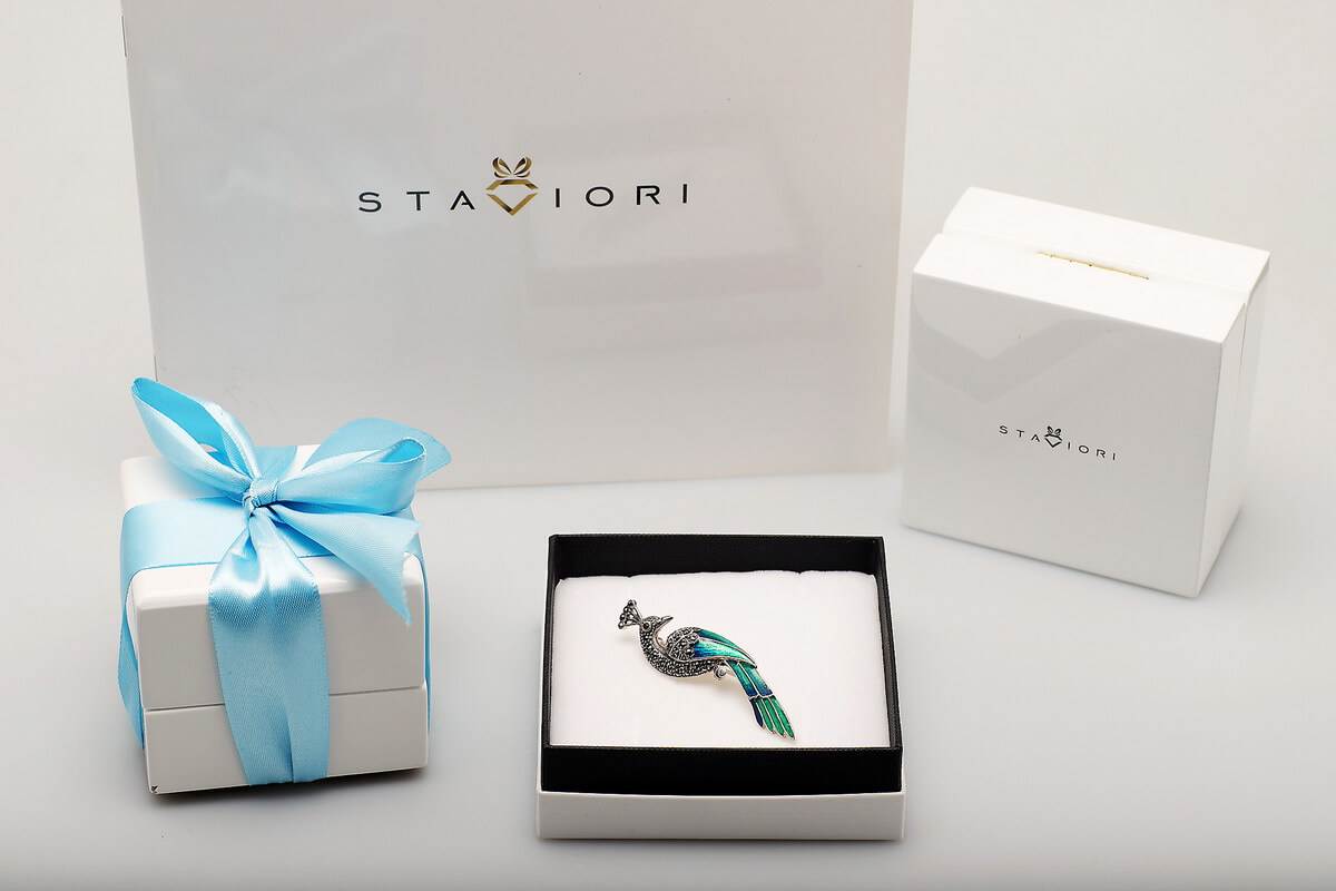 Sujuv roosikujuline pross, valmistatud 925 hõbedast. Punase emailiga kaetud õrnad kroonlehed kontrastivad kaunilt roheliste lehtedega, rõhutades motiivi loomulikku iseloomu. Tükki täiendavad säravad markasiidid, mis annavad ehtele elegantsi ja sära. See on eriline detail, mis lisab igale riietusele romantikat ja peenust.